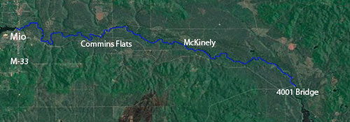 The wee burg of Mio is located in Northern Lower Michigan some 3.5 hours drive time from Detroit. Follow I-75 north to exit 202 which is M-33. Go north for about 36 miles, drive thru Mio and go thru the intersection of M-33 and M-32. At the bottom of the hill to the right (east) is the boat launch that I use as a base for my trips. From here all access points on the river are easily reached via paved county roads.